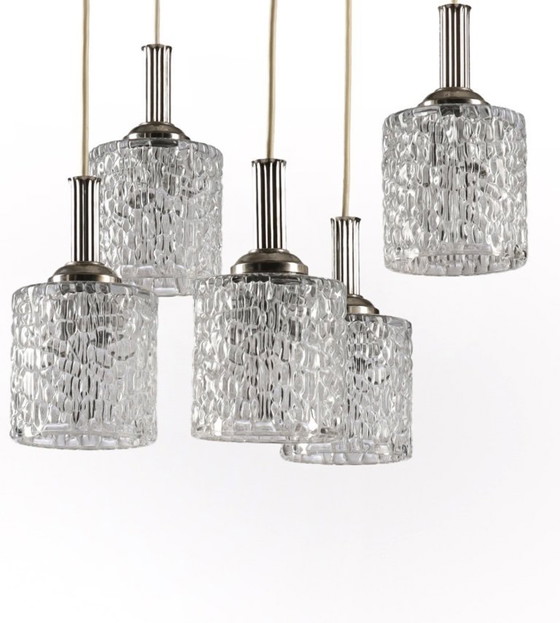 Dieser exquisite Mid-Century-Kronleuchter aus den 1970er Jahren besticht durch sein Design mit fünf Glasschirmen, von denen jeder ein strukturiertes Muster aufweist, das das Licht wunderbar streut. Die silbernen Metallakzente verleihen ihm einen Hauch von Eleganz und machen ihn zu einem perfekten Mittelpunkt für jeden Raum. Sein zeitloses Design ist ideal für alle, die Vintage-Ästhetik und hochwertige Handwerkskunst zu schätzen wissen.