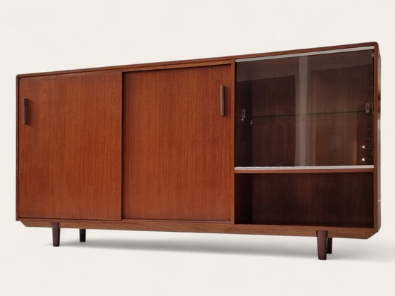 Dieses Midi-Board besticht durch seinen natürlichen skandinavischen Charme dank seines eleganten Designs und des hochwertigen Teakfurniers. Die runden, konischen Holzbeine verleihen dem Schrank zusätzlichen Charme und Eleganz. Die dezent gestalteten Holzgriffe tragen ebenfalls zu seinem authentischen Charakter bei.