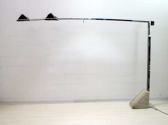 Große Stehlampe von unbekanntem Designer, aus Stahl und Travertinfuß. Die Lampe erstreckt sich bis zu einer maximalen Länge von 325 cm, während die minimale Länge 255 cm beträgt.