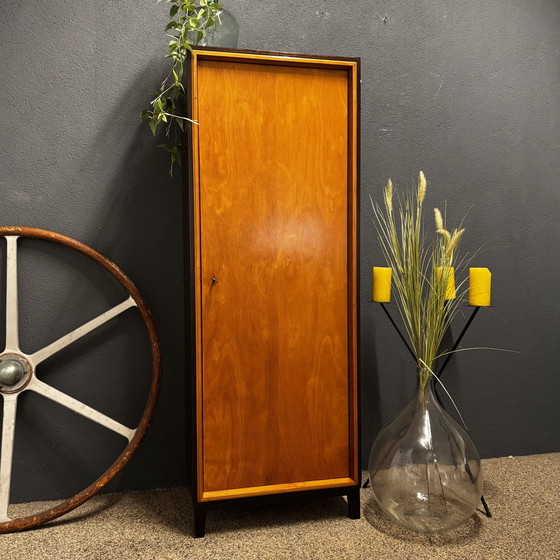 Der Schrank befindet sich in sehr gutem Vintage-Zustand mit minimalen, altersbedingten Gebrauchsspuren. Das originale Werksetikett auf der Rückseite ist vollständig erhalten. Das originale, funktionstüchtige Schloss mit Schlüssel ist vorhanden.