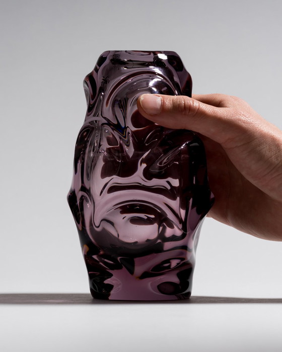 Die Vase ist aus dickem, leuchtendem Glas geblasen und zeigt Beráneks charakteristischen Stil: fließende organische Formen, subtile Asymmetrie und ein ausgeprägter Sinn für materielle Ausdruckskraft. Die Masse des Stücks (über 1,2 kg) verleiht ihm nicht nur visuelle, sondern auch physische Schwere - es ist ein Glas, das man genauso gut sehen wie fühlen kann. Seine abgerundete, taktile Silhouette und die meisterhafte Beherrschung der Form erinnern an die Experimente der Epoche mit Biomorphismus und Handwerk im Spannungsfeld mit den Idealen der Moderne.