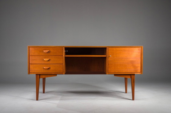 Zur Versteigerung steht ein atemberaubender Schreibtisch aus den 1960er Jahren, der in Deutschland hergestellt wurde. Er ist aus hochwertigem Teakholzfurnier gefertigt und wurde vor kurzem in unserer Werkstatt restauriert, um seine volle Pracht zu entfalten. Dieser doppelseitige Schreibtisch kombiniert Mid-Century-Funktionalität mit zeitlosem, skandinavisch inspiriertem Design, was ihn zu einem perfekten Statement für ein Heimbüro oder einen Chefarbeitsplatz macht.