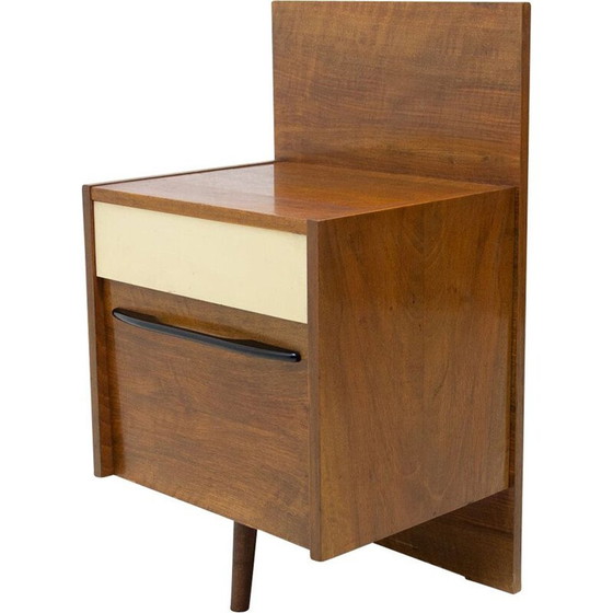 Dieser Nachttisch wurde von Mojmír Požár für UP Závody entworfen und in der ehemaligen Tschechoslowakei in den 1960er Jahren hergestellt. Nussbaum und Buchenholz.