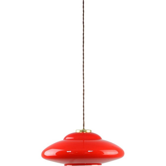 Mid Century Pendelleuchte aus rotem Glas und Messing Saucer