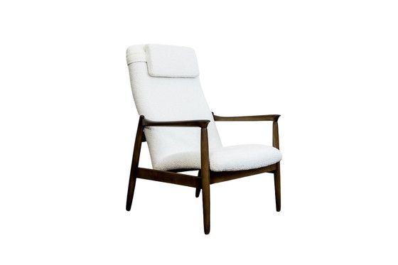 Hochlehniger Sessel GFM-64, entworfen von Edmund Homa, hergestellt in der Gościcińska-Möbelfabrik in Polen in den 1960er Jahren. Dieser Sessel hat ein Gestell aus massiver Buche mit gedrechselten Beinen, Stützbalken unter der Sitzfläche und der Rückenlehne sowie lange, elegant profilierte Armlehnen. Der ergonomische Sitz wurde neu mit einem weißen Schlingenstoff bezogen. Für das Hochlehner-Modell GFM-64 hat Edmund Homa auch eine passende Fußstütze entworfen, die auf Anfrage erhältlich ist.