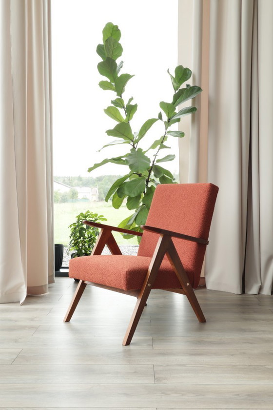 Wir bieten Ihnen einen Sessel im skandinavischen Stil aus der Mid-Century-Ära an. Unser Sessel, nach gründlicher Renovierung, hat einen modernen belgischen Bouclestoff in Rostfarbe. Buchenholz in dunkler Walnussfarbe, massiver Sitz mit Federn. Angelehnte Lehne, die hohen Komfort garantiert. Die langen Armlehnen ermöglichen eine bequeme Positionierung des gesamten Arms. Perfekt als bequemes und stilvolles Sitzelement. Er eignet sich als bequemer Sitz für Eltern im Kinderzimmer. Perfekt für längeres Sitzen beim Arbeiten oder Lesen. Ein bequemer Platz zum Entspannen und Ausruhen. Abmessungen: Höhe - 76 cm, Breite - 61 cm, Tiefe - 68 cm, Sitztiefe - 51 cm, Sitzhöhe - 38 cm.