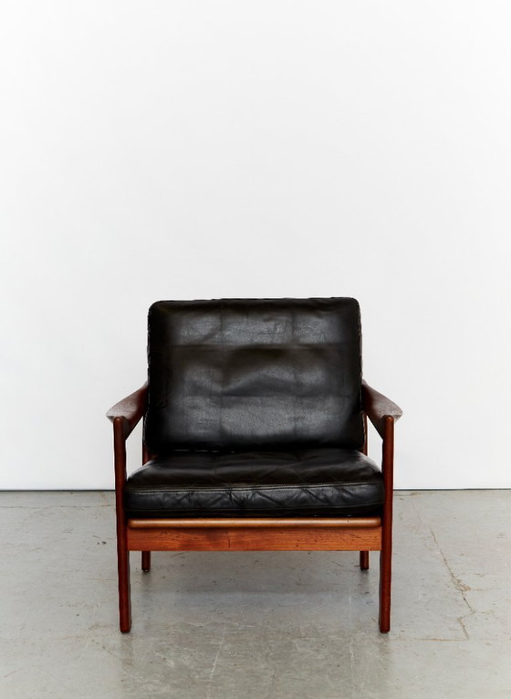 Wunderschönes Design von Illum Wikkelsø für Niels Eilersen. Teakholzrahmen mit schwarzem Lederbezug. Die geschwungenen, organisch geformten Armlehnen machen dieses Stück einzigartig. Sehr hochwertige Verarbeitung.