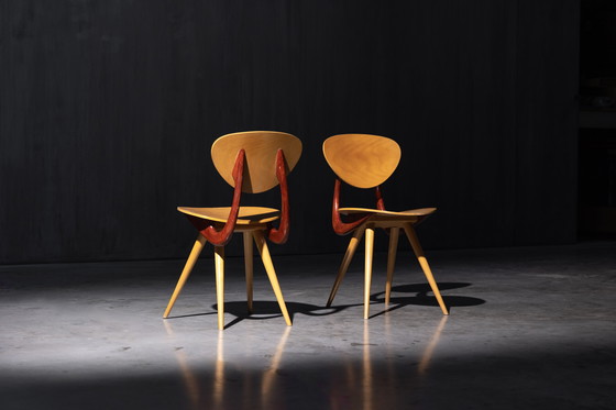 Skulpturale Stühle des französischen Herstellers Stella, hergestellt in den 1950er Jahren. Bekannt für die innovative Verwendung von versteckten Bolzen, boten Stellas Entwürfe sowohl Stärke als auch Eleganz - ein Erbe, das begonnen wurde, als das Unternehmen in den 1920er Jahren von Schubkarren auf Möbel umstieg. Diese Stühle zeichnen sich durch wunderschön geschwungene, hornartige Rückenlehnen aus einem satten, rötlichen Holz aus, die mit zart geformten Sitzflächen und Rückenlehnen aus einem helleren Holz kombiniert sind, das wegen seines warmen, honigfarbenen Tons und seiner subtilen Maserung ausgewählt wurde. Das Zusammenspiel der kontrastierenden Hölzer verleiht ihnen einen dynamischen, fast organischen Charakter. Mit ihren originalen Stella-Etiketten sind sie ein seltenes Beispiel für die französische Handwerkskunst der Jahrhundertmitte mit industriellem Geist.