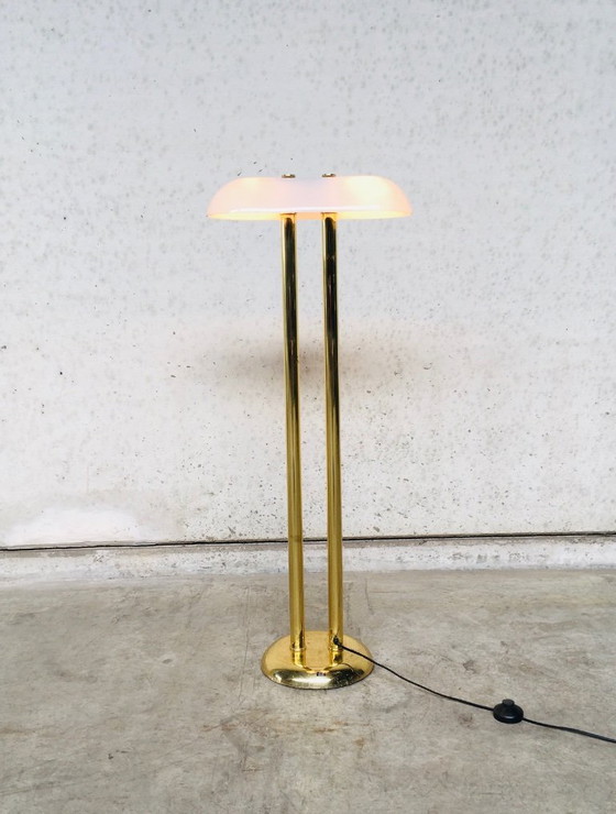 Vintage Midcentury Modern Design Stehlampe / Vloer Lampe im Hollywood Regency Stil von Vibia, Spanien, 1970er Jahre. Messingsockel mit weißem Glasschirm. Alles original und in gutem Zustand. 114 cm x 45,5 cm x 19 cm.