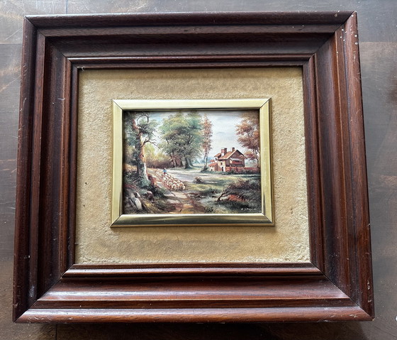 Dieses exquisite Miniatur-Emaillegemälde auf Metall, signiert von Esther, fängt eine friedvolle, ländliche Szene ein. Das detailreiche Kunstwerk ist in edlem Holz gerahmt, was seinen klassischen Charme unterstreicht. Ein perfektes Stück für Kunstliebhaber, die ein einzigartiges Schmuckstück für ihre Räume suchen.
