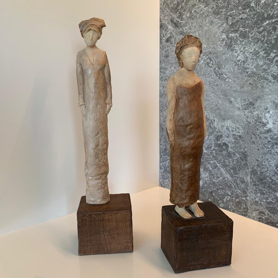 Diese weiblichen Figuren mit langgestreckten Körpern in kontemplativen Posen haben eine erdige, lehmartige Textur in gedämpften Naturtönen