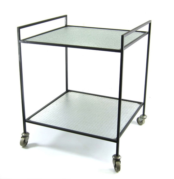Dieser Wagen besticht durch ein elegantes schwarzes Metallgestell mit eingelegten Glasablagen, die ihm eine markante grafische Optik verleihen. Ein außergewöhnliches Sammlerstück und ein echter Blickfang in einem minimalistisch-modernen Interieur.