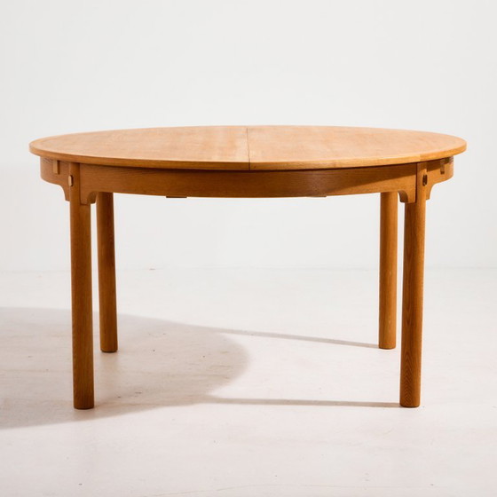 Esstisch 'Modell 140' aus Eiche mit zwei Verlängerungsstücken aus der Serie 'Øresund', die Børge Mogensen in den 1950er Jahren für Karl Andersson & Söner entwarf. Die Möbelserie wurde nach der Øresundbrücke benannt, die Dänemark und Schweden verbindet, und verweist auf die Zusammenarbeit zwischen dem dänischen Designer und dem schwedischen Hersteller. Der Designer war einer der herausragendsten dänischen Designer, denn die Form seiner Möbel war das Ergebnis eines direkten Kontakts mit dem Material und einer tiefen Kenntnis desselben. Der Tisch zeichnet sich durch aufregende Formen, die Verwendung von Naturmaterialien und präzise Details aus. Die Holzteile des Tisches wurden vollständig restauriert.
