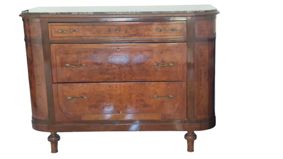 Dieses Möbelstück verfügt über drei Schubladen: zwei sehr große und eine kleinere. Es ist seit drei Generationen in Familienbesitz und verkörpert die zeitlose Eleganz klassischen Designs – perfekt für alle, die ihrem Zuhause einen Hauch von Raffinesse verleihen möchten. Das Massivholzgestell wird von einer ebenfalls originalen schwarzen Marmorplatte gekrönt, die einen optischen Kontrast erzeugt und die natürliche Schönheit der Materialien hervorhebt.