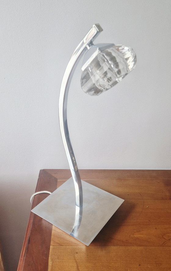 Bringen Sie mit dieser Lampe im skulpturalen Design einen Hauch von Modernität und Eleganz in Ihr Zuhause. Ihr gebogener Fuß aus verchromtem Metall und der verstellbare Kopf aus transparentem gepresstem Glas rufen eine schlichte und zugleich anspruchsvolle Ästhetik hervor.