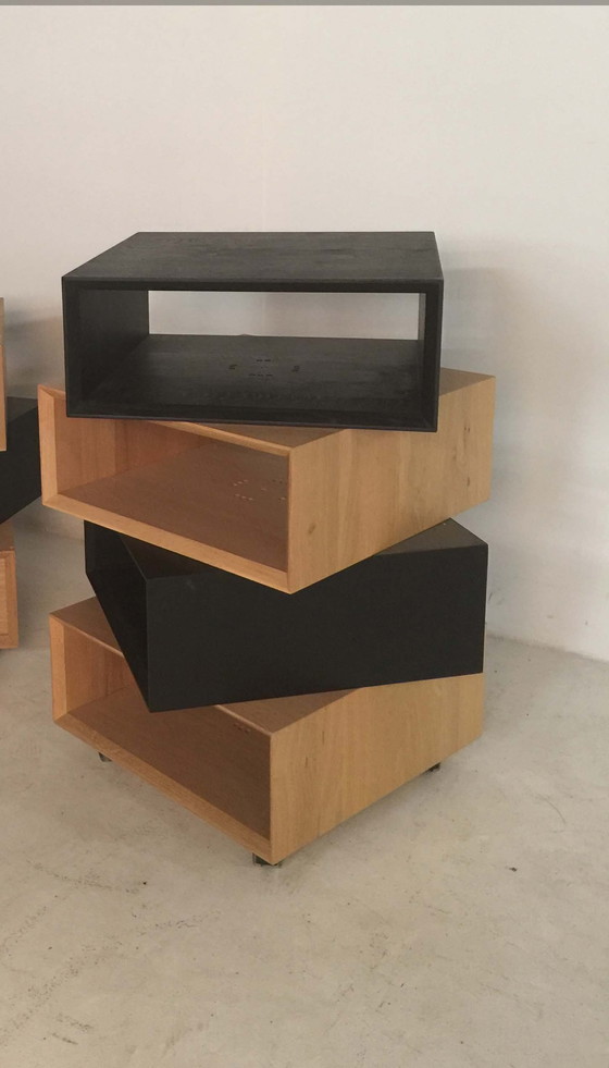 Zu verkaufen: Beistelltisch/Schrank auf Rädern - modern und multifunktional Sind Sie auf der Suche nach einem stilvollen und praktischen Möbelstück, das sowohl als Beistelltisch als auch als Aufbewahrungsschrank dienen kann? Dieses einzigartige Designerstück ist die perfekte Wahl! Eigenschaften: Einzigartiges Design: Besteht aus 4 rechteckigen Formen, die spielerisch übereinander gestapelt sind. Farbkombination: Elegante Mischung aus Eiche natur und schwarz, passend für jedes Interieur. Material: Aus massiver Eiche - langlebig und hochwertig. Mobilität: Steht auf 4 Schreibtischrollen, leicht zu bewegen. Zustand: Immer als Ausstellungsstück oder Ausstellungsmodell benutzt, also so gut wie neu. Sie kaufen dieses Möbelstück direkt vom Möbelhersteller, der für Qualität und Zuverlässigkeit steht. Ein schönes und zeitloses Design, das Funktionalität und Ästhetik vereint! Maße und Preis: 50x50x85 (LxBxH) Interessiert? Zögern Sie nicht, uns zu kontaktieren. Dieses einzigartige Designstück könnte bald Ihnen gehören!