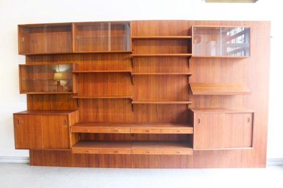 Vintage-Wohnwandsystem aus Teakholz, Modell „Domi 3“, hergestellt von Troeds Bjärnum in Dänemark in den 1960er Jahren. Dieses System bietet vielfältige Konfigurationsmöglichkeiten. Das Set besteht aus: 4 Wandpaneelen (H 216 x B 80 cm) und 1 gekürztem Paneel (H 216 x B 40 cm), 2 Schränken mit Doppelschiebetüren, 4 Vitrinen mit Glasschiebetüren, 4 Schränken mit je 2 Schubladen, 6 Einlegeböden und 1 Zeitschriftenhalter. Das Wohnwandsystem ist in gutem Vintage-Zustand. Ein Paneel wurde gekürzt und muss positioniert werden, damit die Elemente daran befestigt werden können. Es kann bei Bedarf weiter gekürzt werden. Ein Paneel wurde ausgeschnitten und mit einem Stück des gleichen Holzes aufgefüllt (siehe Foto). Ein Haken zum Aufhängen des Systems ist angeklebt.