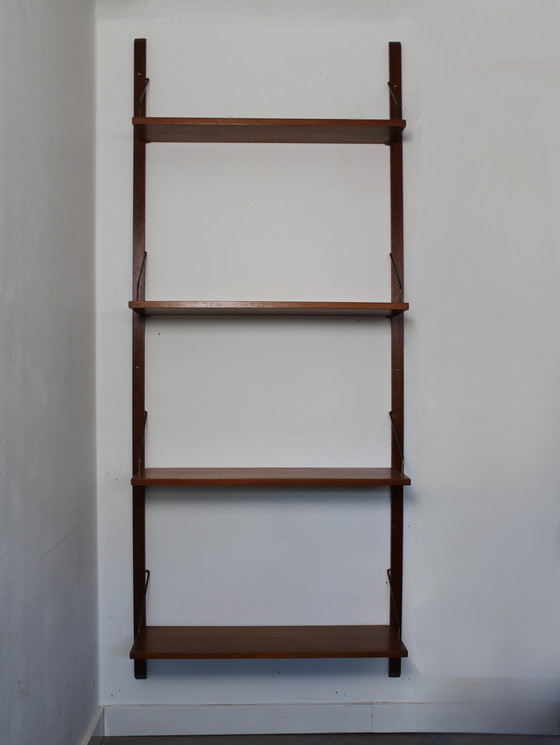Dieses spezielle System besteht aus vier Regalen und zwei Ständern, die alle in schönem Teakholz ausgeführt sind. Das System bietet nicht nur ein stilvolles Aussehen, sondern ist auch äußerst praktisch für die Präsentation verschiedener Gegenstände.