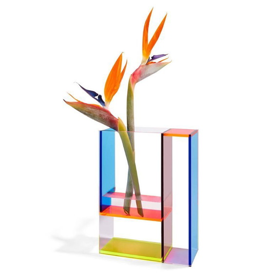 Die Mondri Neon 3-in-1 Vase ist von der niederländischen Kunstbewegung De Stijl inspiriert. Sie besteht aus transparenten Acrylplatten, die ein wunderschönes Spiel von Farben und Schatten erzeugen.
