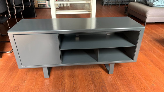 Elegantes und funktionelles Sideboard/TV-Schrank aus der Serie Modular von Müller Möbel, Typ S36-H2-128, in Grau (RAL 7016). Ganz aus Metall mit dezenten Kabeldurchlässen in jedem Element. Türverschluss mit Magnet und Soft-Touch-System.