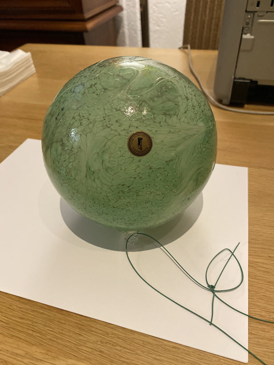 Diese exquisite, mundgeblasene Glaskugel ist ein Beweis für die Kunstfertigkeit und das Können traditioneller Glasmacher. Ihr leuchtender Grünton und die filigranen Muster erzeugen einen faszinierenden visuellen Effekt und machen sie zu einem Blickfang in jeder Sammlung oder Einrichtung.