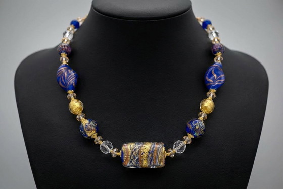 Jedes Stück wird von Glasmachermeistern in Handarbeit gefertigt und ist somit ein einzigartiges Schmuckstück. Die kobaltblauen Glasperlen mit Goldverzierungen bilden einen raffinierten Farbkontrast, der durch klare Kristalle und goldene Details zusätzlich betont wird und der Kette Glanz und Eleganz verleiht.