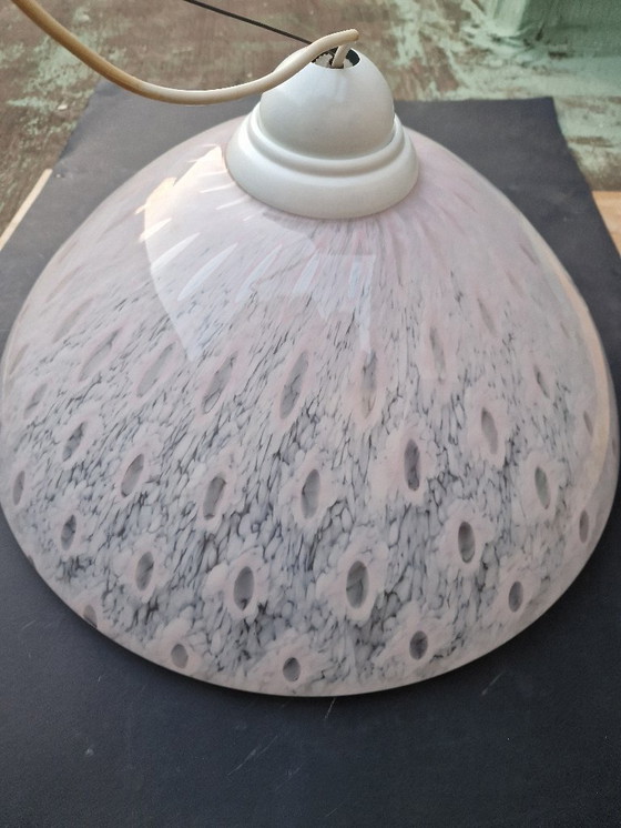 Verschönern Sie Ihr Interieur mit diesem exquisiten Mid-Century-Kronleuchter aus Muranoglas – ein wahrer Ausdruck der Art-déco-Eleganz der 1950er- und 1960er-Jahre. Der Opalglasdiffusor mit seinem einzigartigen Marmormuster besticht durch markante ovale Einschlüsse, die einen „Ocelleneffekt“ erzeugen und jedem Raum einen Hauch von Raffinesse verleihen. Die weiß lackierte Metallhalterung und die Deckenplatte ergänzen das Glas und sorgen für eine nahtlose Integration in Ihre Einrichtung. Perfekt für alle, die zeitloses Design und außergewöhnliche Handwerkskunst schätzen – dieser Kronleuchter wird garantiert zum Blickfang in Ihrem Zuhause. Erkundigen Sie sich noch heute, um dieses atemberaubende Stück zu erwerben.