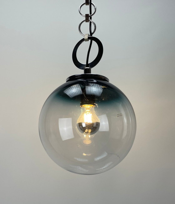 Werten Sie Ihr Zuhause mit dieser seltenen Muranoglas-Hängeleuchte von VETRO auf, die in den 1960er Jahren in Italien hergestellt wurde. Dieses Vintage-Stück zeichnet sich durch ein auffälliges Design aus, das von klarem Glas in ein tiefes, sattes Blau übergeht und so einen faszinierenden visuellen Effekt erzeugt. Mit der Aufschrift "VETRO ARTISTICO FAVORATO A MAN..." ist diese Leuchte ein Zeugnis für die handwerkliche Kunstfertigkeit, für die Muranoglas berühmt ist. Die Pendelleuchte hängt elegant an einer verchromten Halterung, die mit einer Kette aus runden Ornamenten verziert ist, allerdings weist sie einige Rostspuren auf. Sie kann auch ohne die Kette verwendet werden, indem die Verkabelung ersetzt wird, um einen eleganten, modernen Look zu erzielen. Dieses seltene Stück verkörpert den Geist des italienischen Designs der 1960er Jahre und ist eine faszinierende Ergänzung für jedes Interieur. VETRO ist eine angesehene italienische Glasmanufaktur, die für ihre exquisite Handwerkskunst und ihr innovatives Design bekannt ist, insbesondere im Bereich des Muranoglases. Murano liegt in der venezianischen Lagune und ist seit dem 13. Jahrhundert ein Zentrum der Glasproduktion. Die Kunsthandwerker der Insel sind berühmt für ihre meisterhaften Glasbläsertechniken und schaffen atemberaubende Stücke, die von dekorativer Kunst bis hin zu Gebrauchsgegenständen reichen. ABMESSUNGEN Höhe: 25cm Durchmesser: 25cm Kordellänge: 80cm PRODUKT DETAILS Zustand: Gut - einige Gebrauchsspuren, Kratzer auf dem Glas und Rost auf dem Chrom Material: Glas, Chrom Fassung: E27 Ohne Glühbirne und mit Deckenkappe Hersteller: VETRO Herstellungszeitraum: 1960