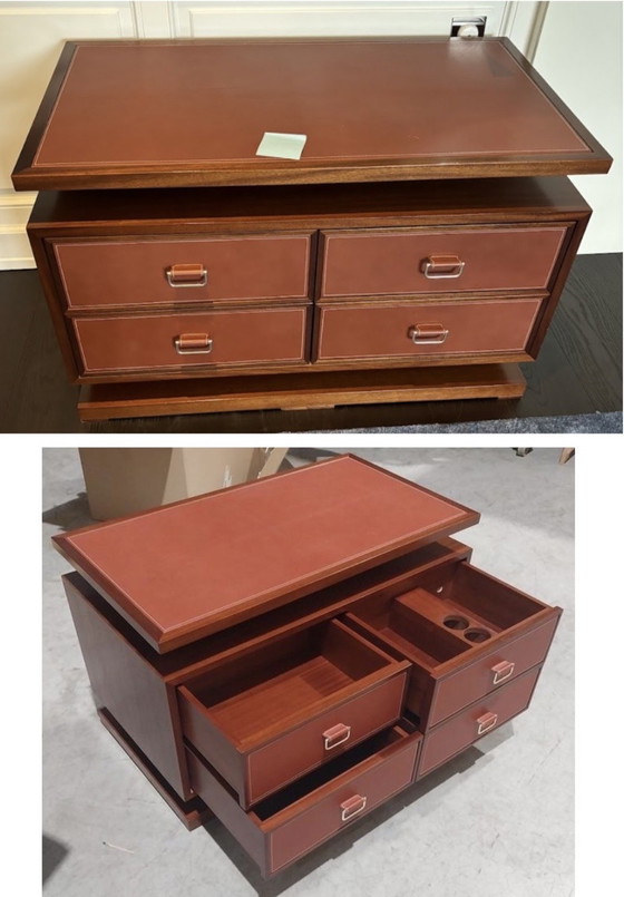 Kombination aus Holz, Leder und Glas verleihen dem Möbelstück eine ruhige
