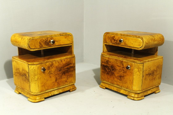 Ein Paar farbige Art-Deco-Nachttische in sehr gutem Originalzustand mit Patina und interessanter, zeitgenössischer Oberflächenbehandlung. Holzmaserung auf Holz.