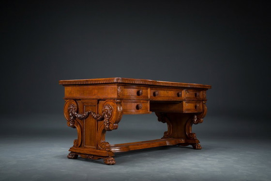 Prächtiger Neo-Renaissance-Schreibtisch aus den 1920er Jahren, der mit seinem reich geschnitzten Eichengestell und seinen eleganten Proportionen eine hervorragende Handwerkskunst zeigt. Dieses markante Stück wurde professionell restauriert, wobei sein authentischer Vintage-Charakter erhalten blieb.