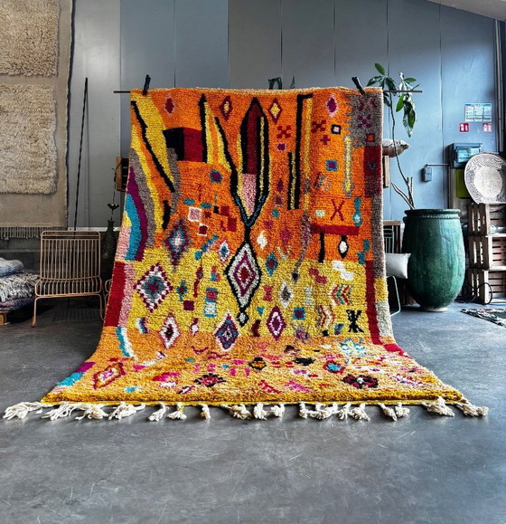 Dieser Teppich besticht durch einen warmen Senf- und Ockerton, der durch leuchtende Akzente in Rosa, Türkis, Rot, Schwarz und Elfenbein bereichert wird. Die Komposition vereint abstrakte Symbole, Rautenmotive und vertikale grafische Elemente und erzeugt so einen dynamischen und modernen visuellen Rhythmus. Das Design wirkt spontan und zugleich perfekt ausbalanciert – ein Markenzeichen der Boujad-Weberei. Dieser von erfahrenen marokkanischen Kunsthandwerkern handgewebte Teppich bietet einen dichten, weichen Wollflor und hervorragenden Gehkomfort. Als Neuware ist er in makellosem Zustand, mit leuchtenden Farben und einer fehlerlosen Struktur.