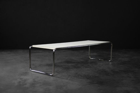 Eine Design-Ikone. Der niedrige Kiga Couchtisch ist eine Nachkriegsinterpretation des ikonischen Laccio-Tisches, der 1924 von Marcel Breuer als Teil seines Experiments mit gebogenen Stahlrohren entworfen wurde. Laccio war Teil einer bahnbrechenden Möbelkollektion, bei der Breuer verchromten Stahl und eine einfache, geometrische Form verwendete, um eine visuell auffallend leichte und dennoch robuste Struktur zu schaffen. Das minimalistische Design des Tisches spiegelt die Bauhaus-Philosophie wider, wonach die Form der Funktion folgt, und ist bis heute eine Ikone der Moderne. Das hier angebotene Exemplar wurde von Gavina hergestellt, was seinen Sammlerwert noch unterstreicht und ihn in die Geschichte der Neuinterpretation klassischer Bauhaus-Entwürfe einbettet. Nach 1962 begann der italienische Hersteller Gavina, diesen Tisch unter offizieller Lizenz zu produzieren und mit dem Label "GAVINA reg trademark KIGA SpA. Made in Italy" und verkaufte ihn als Teil der Kollektion Breuer for Gavina. Der Tisch wurde schnell zu einem Symbol des avantgardistischen Designs des 20. Jahrhunderts, das Funktionalität mit minimalistischer Eleganz verbindet. Seine monochrom weiße Platte strahlt Schlichtheit und Eleganz aus, während die verchromten Beine der Struktur eine zeitlose Eleganz und subtile Leichtigkeit verleihen. Das Gesamtergebnis ist eine harmonische, minimalistische Form, die sich perfekt in moderne Interieurs einfügt und das historische Erbe von Breuer mit aktuellen Einrichtungstrends verbindet. Es ist ein zeitloses Möbelstück, bei dem einfache Form auf meisterhafte Handwerkskunst trifft.