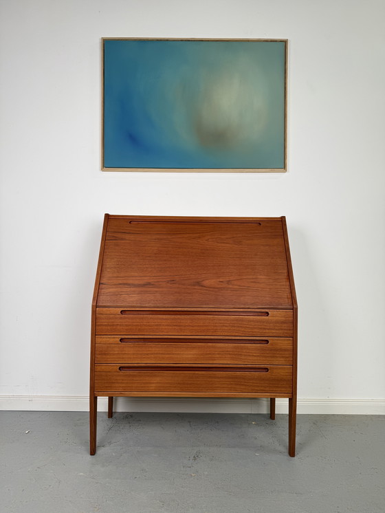This exquisite Nils Jonsson teak secretary, crafted for HJN Mobler, embodies the elegance and functionality of mid-century modern design. Its sleek lines and warm teak finish make it a timeless addition to any sophisticated interior. The piece features a drop-down writing surface that reveals a well-organized interior, perfect for managing correspondence or creative endeavors. Three spacious drawers provide ample storage, ensuring that your workspace remains clutter-free. This secretary is not only a testament to fine craftsmanship but also a versatile piece that can enhance both home and office settings. Invest in this classic design to elevate your space with a touch of Scandinavian charm.