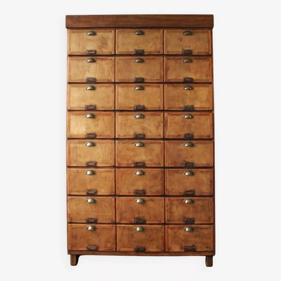 Ein hölzerner Notarschrank aus den 1930er-Jahren, auch Apothekerschrank genannt. Er verfügt über 24 Fächer, die jeweils mit einem Klappverschluss, einem Griff und einem Etikettenhalter ausgestattet sind. Praktisch und elegant zugleich, bietet dieses Möbelstück reichlich Stauraum für Dokumente, Bücher, Kleidung, Schuhe oder Geschirr. Dank seines zeitlosen Designs fügt er sich harmonisch in verschiedene Räume ein, ob Schlafzimmer, Wohnzimmer oder Esszimmer, und verleiht Ihrem Interieur Funktionalität und Charakter. Maße der Fächer: B 34 x H 18 x T 30 cm