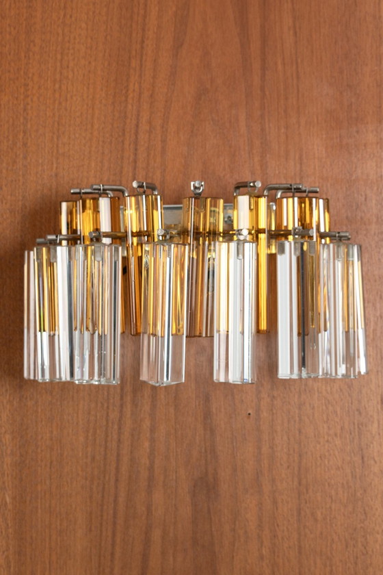 Novaresi Wandlampe aus bernsteinfarbenem und klarem Muranoglas. die Lampe ist schwer, daher empfehlen wir, sie nur an einer festen Wand zu befestigen. in gutem Vintage-Zustand.