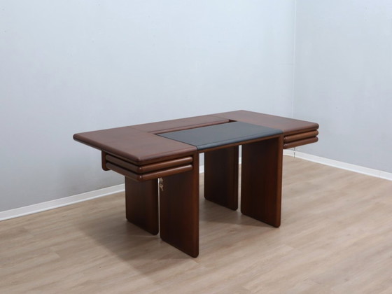 Erleben Sie den Gipfel postmodernen Funktionalismus mit diesem von Ettore Sottsass und Hans von Klier für Olivetti Synthesis entworfenen Schreibtisch. Als wahres Zeugnis italienischer Industriekunst der 1980er-Jahre vereint dieses Möbelstück eine strenge, minimalistische Silhouette mit unerwarteten, haptischen Details. Die großzügige Holzoberfläche wird elegant durch eine zentrale Ledereinlage unterbrochen und bietet so ein anspruchsvolles haptisches Erlebnis für den Arbeitsalltag.