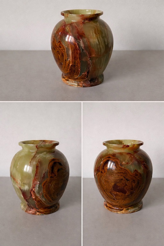 Eine dekorative Vase aus natürlichem Onyx mit einzigartigen Steinmustern und sanften, durchscheinenden Farbtönen. Jedes Stück ist ein Unikat und verleiht jedem Interieur eine elegante, zeitlose Note. Perfekt als eigenständiges Dekorationsobjekt oder für minimalistische Blumenarrangements.