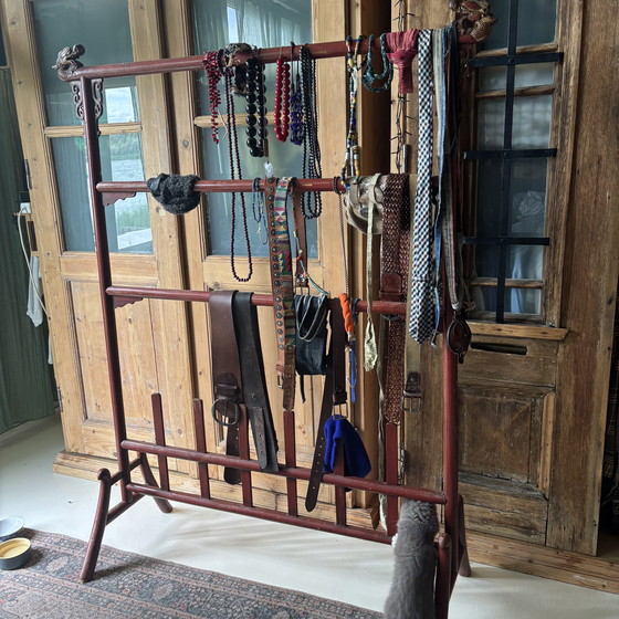 Dieser einzigartige Garderobenständer im orientalischen Stil ist aus Holz gefertigt und an den oberen Ecken mit aufwendigen Drachenschnitzereien versehen. Die kräftigen Rot- und Brauntöne verleihen ihr einen Hauch von Eleganz und kulturellem Charme. Die Garderobe eignet sich perfekt für die Aufbewahrung von Gürteln, Krawatten und Halsketten und ist sowohl funktional als auch dekorativ. Ideal für alle, die asiatisch inspiriertes Dekor schätzen.