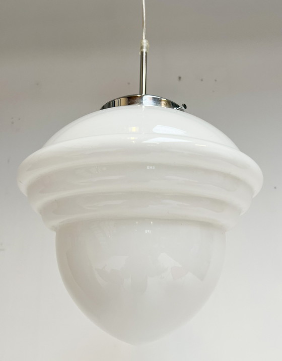 Tolle Deckenleuchte mit dekorativem, erhöhtem Rand aus den 1960er Jahren, Deutschland. Hergestellt aus Opalglas an einem 110 cm langen Kabel mit einer Metallhalterung. Der Glasschirm hat eine Höhe von 30 cm. Der Glasschirm mit Metallsockel ist ca. 43 cm. Die Höhe der Lampe kann mit dem zu kürzenden Kabel bestimmt werden. Das Glas ist unbeschädigt. In funktionierendem und gepflegtem Zustand und mit einer E27 Fassung.