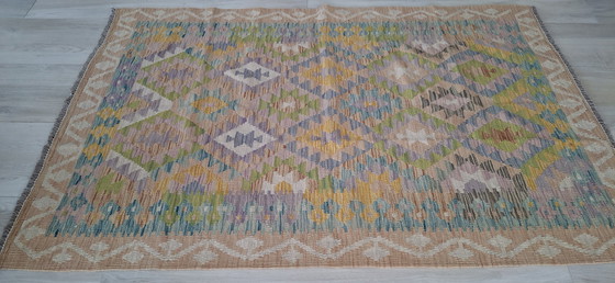 Verleihen Sie Ihrem Zuhause mit diesem wunderschönen, handgeknüpften Kelim aus Afghanistan einen Hauch von Farbe und Authentizität. Die sanften Pastellfarben und das einzigartige Muster machen diesen Kelim zu einem echten Blickfang in jedem Raum. Perfekt für ein Interieur im Bohème- oder eklektischen Stil.