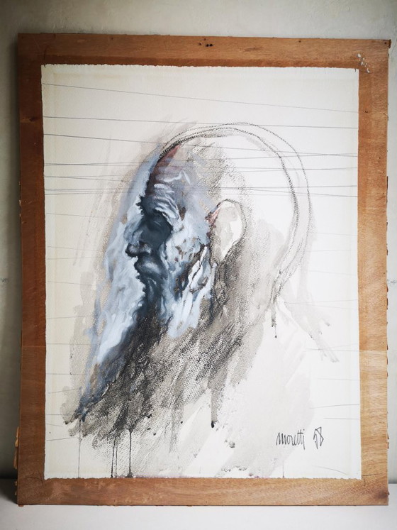Entdecken Sie ein Originalwerk von Raymond Moretti, einem Künstler, der für seine Fähigkeit bekannt ist, das Wesen der Menschheit durch kraftvolle und ausdrucksstarke Pinselstriche einzufangen. Dieses Original, entstanden auf Papier in einer Kombination aus Gouache und Lavierung, präsentiert ein eindrucksvolles Profil, das Stärke und Verletzlichkeit zugleich ausstrahlt.