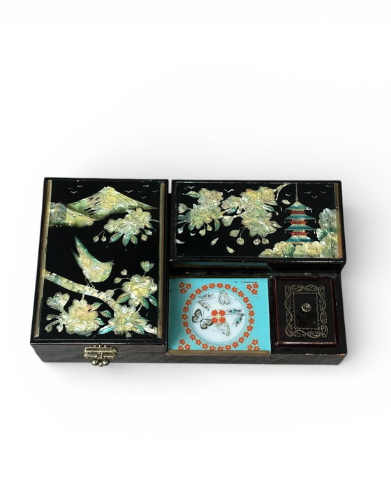 Ostasiatische Schmuckschatulle aus schwarzem Lack mit Perlmuttintarsien, eine traditionelle koreanische Handwerkskunst namens Najeon Chilgi. Diese Schatulle verfügt über mehrere Fächer und zeigt detailreiche Darstellungen von Vögeln, Blumen, einer Pagode und Schmetterlingen.