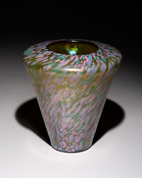 Eine lebendige und außergewöhnlich dekorative Jugendstil-Vase aus mundgeblasenem Kunstglas, hergestellt in Österreich um 1900–1910. Das Gefäß besticht durch ein auffälliges, mehrfarbiges Federdekor in Opalrosa, Türkisgrün, Flieder und zartem Gold – eine irisierende Farbpalette, die stark mit österreichischen und böhmischen Glaskunstwerkstätten des frühen 20. Jahrhunderts wie Loetz, Kralik und Pallme-König assoziiert wird.