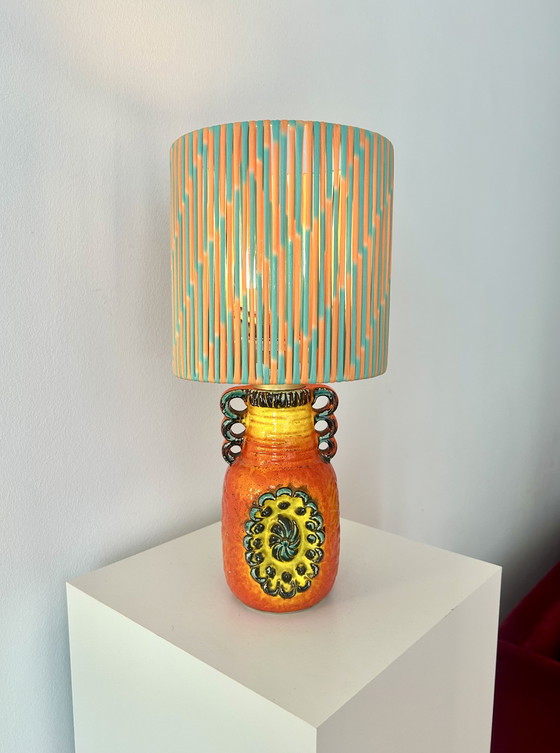 Diese ungewöhnliche Pop Art Akzentlampe wurde aus einer Keramikvase von Dümler & Breiden aus den 1960er/70er Jahren upgecycelt. Die Vase lässt sich stilistisch der bekannten Studio 71 Linie zuordnen – auch wenn der Stempel dies nicht explizit ausweist. Herstellerkennung ist aber klar vorhanden.