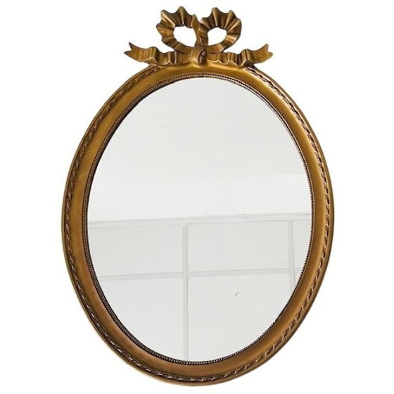 Dieser französische ovale Goldspiegel ist wunderschön mit einer Schleife und einem Band um den Holzrahmen verziert.