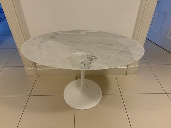 Ein ovaler, 120 cm großer Esstisch im Tulpenstil aus weißem Carrara-Marmor mit glänzendem, weißem Aluminium-Gussgestell.
