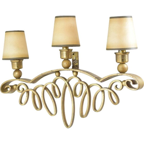 Seltene und große Paar Triptychon Leuchter aus den 1950er Jahren zugeschrieben Raymond Subes.schöne Arbeit in Schmiedeeisen Schnecke mit Goldpatina, erkennbar von dem Künstler Raymond Subes, sicherlich eine Arbeit auf Bestellung, wie der Künstler oft tat.Original-Lampenschirme.in sehr gutem Zustand.Abmessungen: h. 39 / p. 13 / 55 l.Cm.