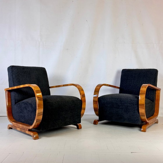 Ein wunderschön restauriertes Paar Art-Déco-Sessel von Heal & Son mit elegant gebogenen Buchenarmen, die die Struktur stützen. Das Kastanienfurnier wurde sorgfältig restauriert und lackiert, um die zeitlose Eleganz der Stühle zu erhalten.