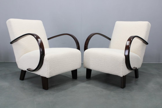 Dieses markante Paar Art-déco-Sessel wurde von Jindřich Halabala entworfen und in den 1940er-Jahren in der Tschechoslowakei gefertigt. Die Sessel zeichnen sich durch Halabalas unverkennbare skulpturale Formensprache aus, die geschwungene Armlehnen aus Buchenholz mit einer kompakten und dennoch eleganten Polsterung verbindet.